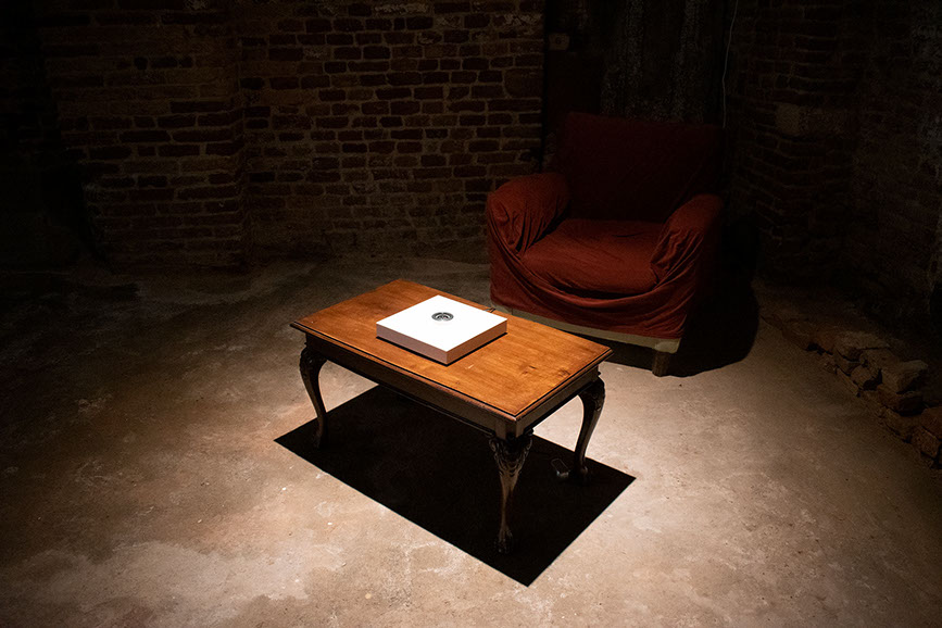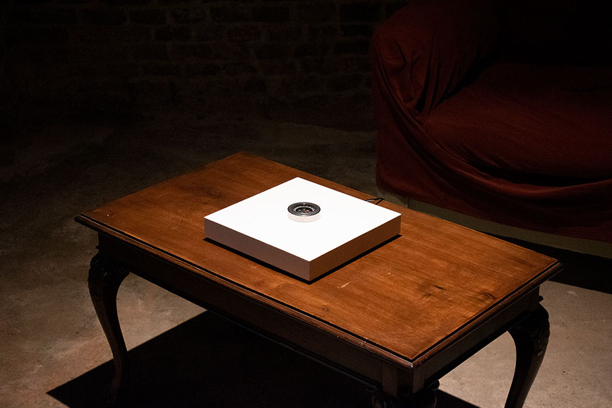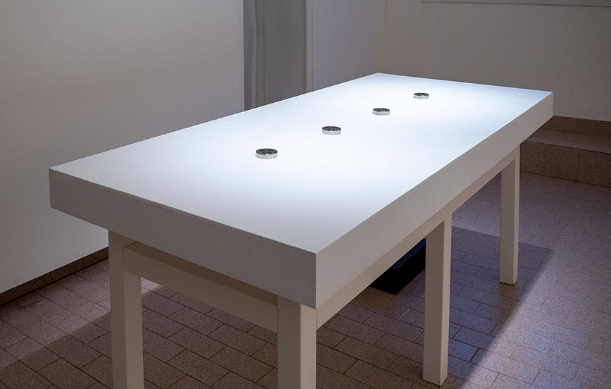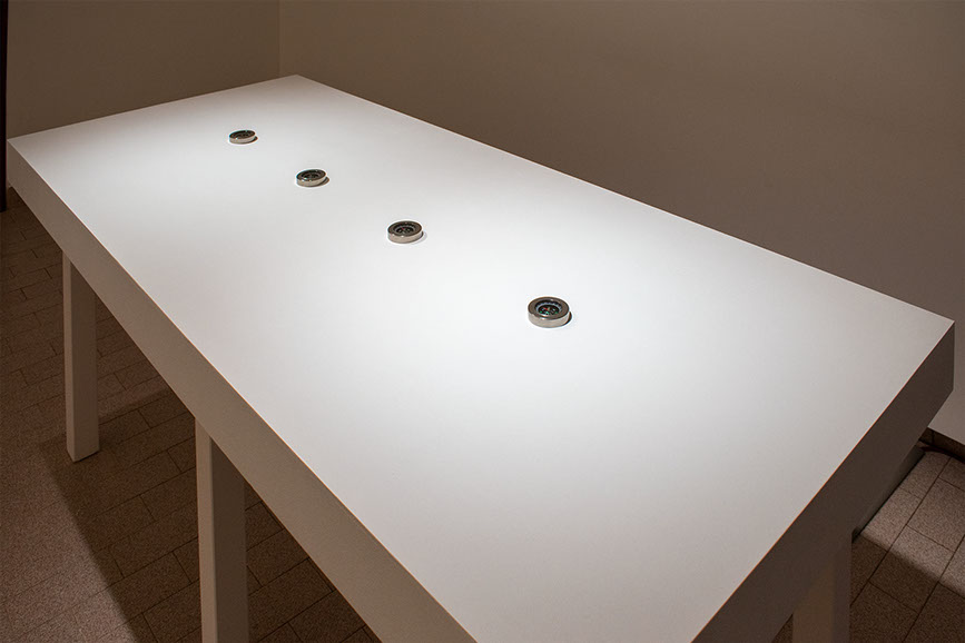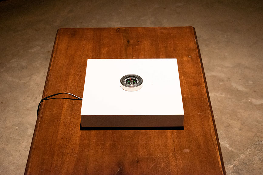 Bussole (Compasses Series), implements a reversal between physicality and immateriality, between balance and imbalance. The series of compasses undergoes the effect of people's voices in the surrounding space, which goes so far as to cause disorientation of the objects themselves, which lose their original function and are no longer able to indicate cardinal points, but enter into a continuous, multidirectional movement.