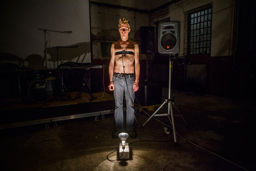 Il musicista “suona” con il cuore, ha un microfono a contatto sul petto nudo tenuto in posizione da una cinghia elastica, e il microfono ne percepisce il battito cardiaco.