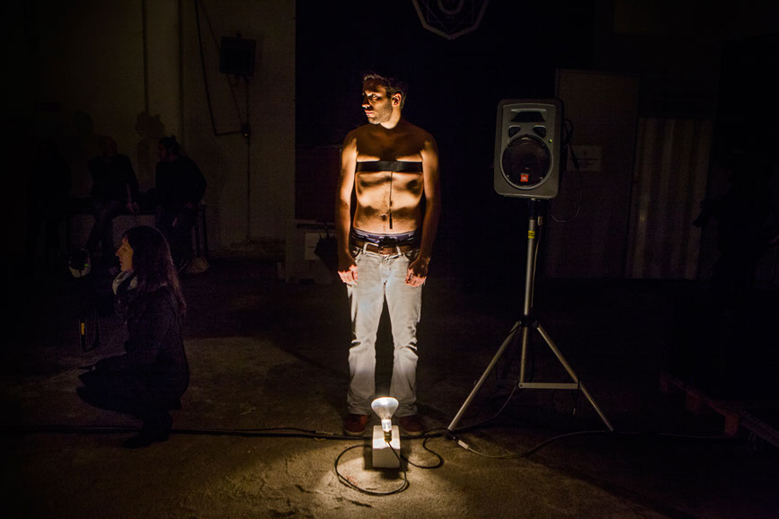 The musician "plays" with the heart, his bare torso is in contact with a microphone, held in place by a strap elastic that perceives the human heartbeat. The heartbeat is not fully controllable, the only thing that is controllable is its speed thanks to concentration techniques. Involuntary movement, necessary for life, uninterruptible, a unique sound always present from birth to