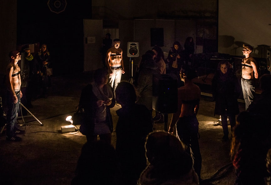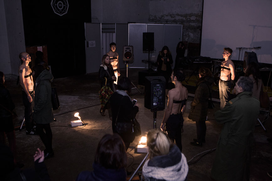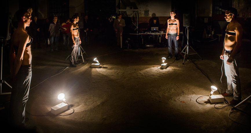 Inside the room, 4 speakers are placed along the sides in a circle facing the centre, with a view to spatialization of the sound produced with the quadraphonic technique.