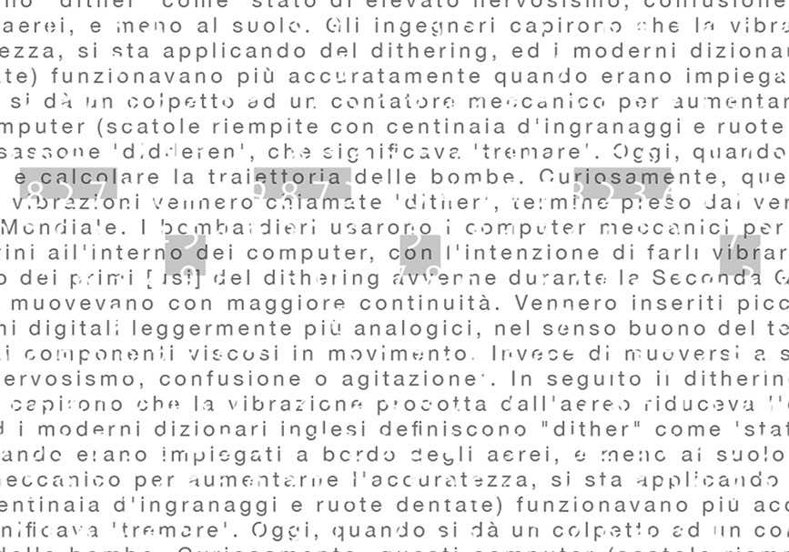 « ...uno dei primi [usi] del dithering avvenne durante la Seconda Guerra Mondiale. I bombardieri usarono i computer meccanici per orientarsi e calcolare la traiettoria delle bombe. Curiosamente, questi computer (scatole riempite con centinaia d'ingranaggi e ruote dentate) funzionavano più accuratamente quando erano impiegati a bordo degli aerei, e meno al suolo. Gli ingegneri capirono che la vibrazione prodotta dall'aereo riduceva l'errore causato dai componenti viscosi in movimento. Invece di muoversi a scatti, si muovevano con maggiore continuità. Vennero inseriti piccoli motorini all'interno dei computer, con l'intenzione di farli vibrare, e queste vibrazioni vennero chiamate 'dither', termine preso dal verbo anglosassone 'didderen', che significava 'tremare'. Oggi, quando si dà un colpetto ad un contatore meccanico per aumentarne l'accuratezza, si sta applicando del dithering, ed i moderni dizionari inglesi definiscono "dither" come 'stato di elevato nervosismo, confusione o agitazione'. In seguito il dithering rese i sistemi digitali leggermente più analogici, nel senso buono del termine. »
