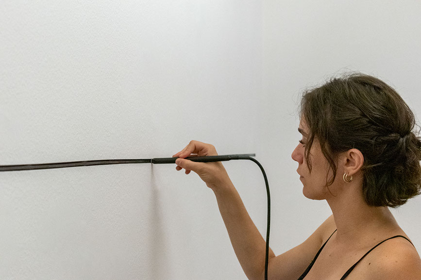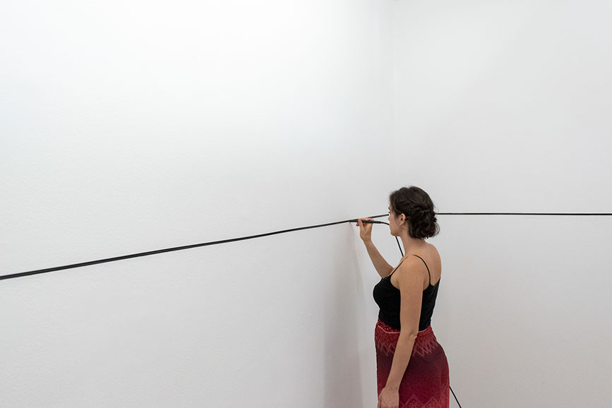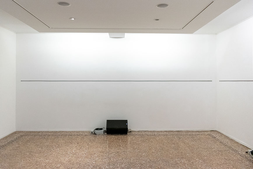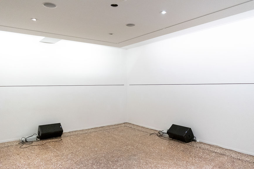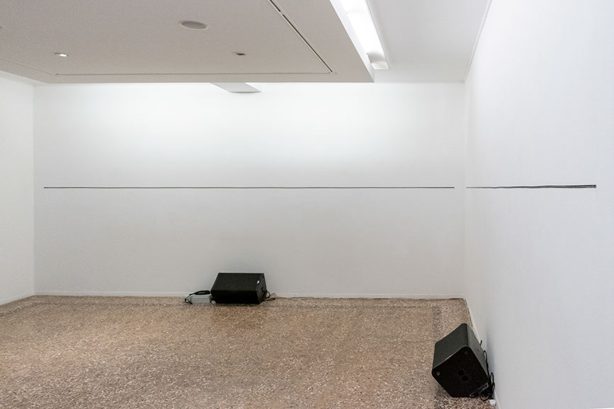 As when we discover or find an ancient and unknown writing, and we need to understand the alphabet with which it was written, the reading sense, the language and finally its content, in this work an effort is similarly required to decode its meaning. A magnetic tape embedded in the wall encloses the answer to the question: "What if the walls could speak?". The viewer is required to make an effort to try to understand the meaning of the engraved text through the use of a "stylus" whose tip is equipped with a magnetic tape head. By passing the stylus over the tape in the wall, the recorded sound is reproduced with an amplification system to which the reading pen is connected. It is up to the hand and the sensitivity of those who handle the stylus to find the right speed and the sense of reading. The groove on the wall traces the environment seamlessly, losing the concept of beginning and end, of writing direction, of codes and forms. Everything becomes circular, the idea of time becomes absurd and therefore it disappears, since, conceptually, every point of this wall is a beginning, and every point is an end.