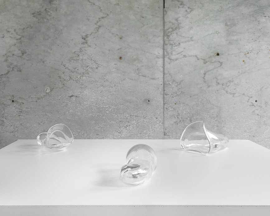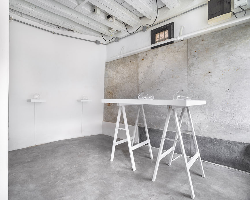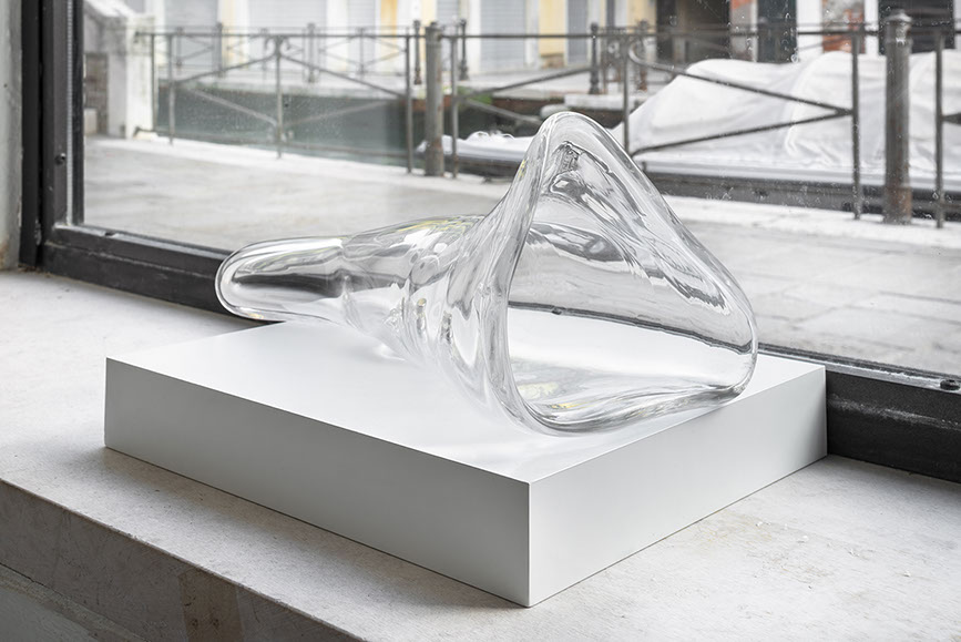 "The series of works animating the main room consists of various elements resulting from the recent work Zorio has conducted within the Murano furnaces, in collaboration with Berengo Studio. Here, alongside local craftsmen, he created a body of works using glass as a sculptural medium and sonic membrane.