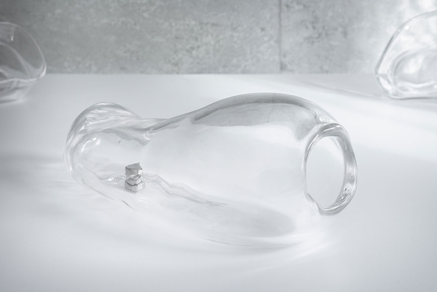 In this instance, glass becomes the primary instrument the artist shapes, considering its ability to contain, propagate, and deform sound. This medium, shaped by both Zorio and the master glassmaker, is suspended between an imaginary linked to maritime poetics and the experimental laboratories, aligning with the technical possibilities of the material that becomes the common thread of the exhibition.