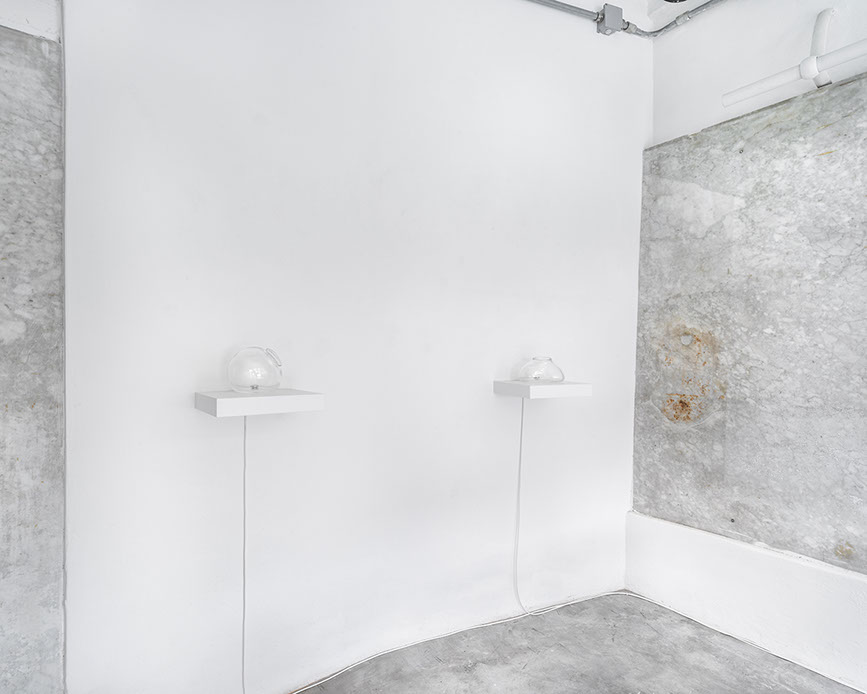 La relazione con il caratteristico spazio della galleria (un ex macelleria) rende il percorso espositivo suddiviso in due momenti distinti, ma tra loro osmotici: il primo composto da vasi distesi come corpi fluttuanti nel mare, appoggiati su un alto tavolo: sono oggetti scultorei di propagazione del suono messi in vibrazione attraverso la manipolazione del campo elettromagnetico che li circonda. Quest’opera in particolare è concepita dall’artista come dispositivo performativo in quanto si compie grazie all’interazione con il pubblico, il quale ha la facoltà di toccare e spostare le sculture sul tavolo, partecipando alla composizione di una polifonia che cambia in base alla posizione di questi contenitori di vuoto, di materia ignota che sono in realtà pieni di vita.