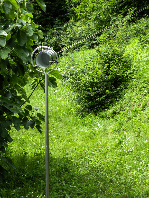 The artist, using a system of cans connected by a wire, wanted to create relationships between the different corners of the rose garden, which are characterized by a multitude of different sounds. The effect is that of a spatial alienation: the cans and wires are immediately perceived as foreign to the surrounding environment, as are the sounds they emit, the origin of which is difficult to determine, if one does not follow the path of the web of wires . In this game of transmissions, the same goes for the speaker, who by speaking in the jars, does not know where their voice will arrive. This game implements a new interaction with the environment, which shows the importance of sound, an intangible item, the concrete definition of the space.