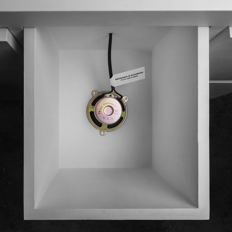 The sound installation Speziale (2012) is a color-neutral parallelepiped composed of ten closed drawers. Each drawer contains a speaker that emits a selected sound. The different sounds are related to recordings of environments and different objects, from the resonance of the Earth (Schumann resonance), the heartbeat of a man, Zadar's marine organ, to the Cave of Crystals of Naica.